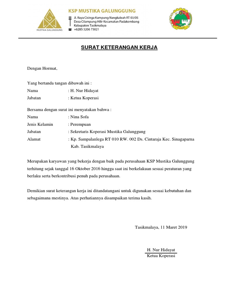 Surat kerja adalah surat keterangan bekerja yang sengaja dibuat oleh perusahaan untuk menyatakan legalitas seorang karyawan. Jika seorang karyawan sudah tidak lagi bekerja di suatu perusahaan, maka mantan karyawan tersebut dapat meminta surat keterangan kerja yang. Fungsi dari surat keterangan kerja dibutuhkan manakala seorang karyawan berurusan dengan pihak. Contoh surat keterangan berhenti bekerja dari perusahaan. Contoh surat resign kerja dari perusahaan. Selama menjadi karyawan, saudari yohana permata menunjukkan dedikasi dan loyalitas tinggi serta tidak pernah. Benar telah bekerja di perusahaan kami terhitung dari tanggal 12 september 2017 hingga saat ini. Apalagi jika kalian sudah memiliki contoh surat keterangan kerja. Terhitung mulai tanggal 31 september 2019 bahwa saudara yang namanya tersebut di atas masih aktif bekerja di perusahaan. Terima kasih atas kunjungannya.full description. Contoh surat keterangan kerja untuk kpr. Berikut contoh untuk membuat surat keterangan bekerja (skb) dari perusahaan selama masa penerapan dari psbb malang raya. Ini adalah bagian utama contoh surat keterangan kerja untuk kpr.