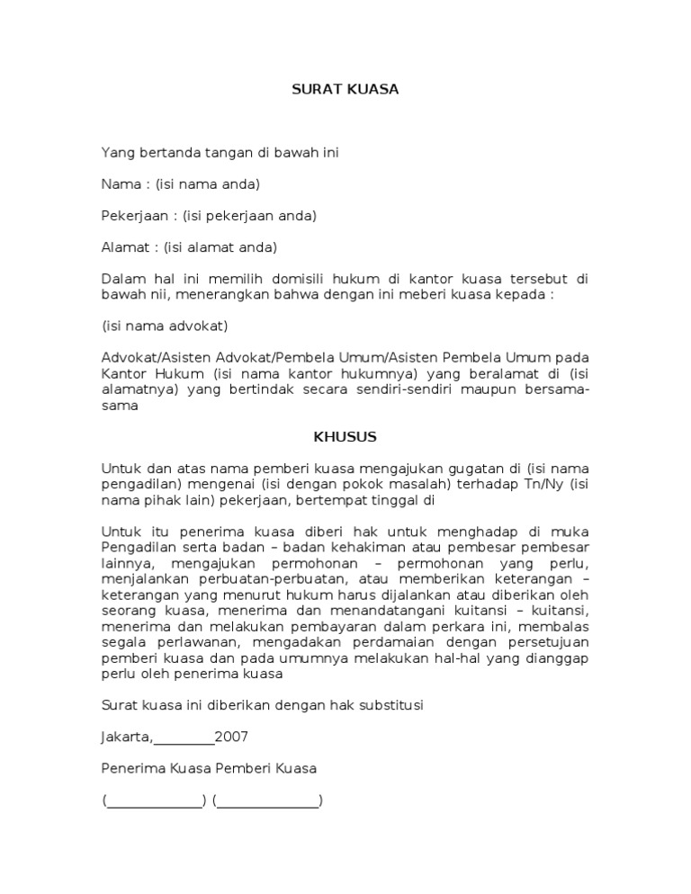 Surat Kuasa Khusus (Pidana) from imgv2-1-f.scribdassets.com 19 rt.03/rw.04 kelurahan sepinggan kecamatan balikpapan selatan kota balikpapan dengan ini. Januari 5, 2012 pada 1:06 pm. Contoh surat kuasa pengacara untuk kepengurusan hukum contoh surat kuasa pengambilan uang di bank bni, mandiri, bca, bri Misalnya surat kuasa untuk perwakilan pengambilan ijazah, pengambilan uang gaji. Apabila surat kuasa khusus yang dibuat tidak memenuhi syarat, maka dapat menjadikan surat kuasa khusus itu tidak dan tentu mengakibatkan tindakan yang dilakukan seperti telah disinggung di atas, surat kuasa khususnya dalam hukum acara, pada prinsipnya berbeda dengan surat kuasa umum. Dan untuk surat kuasa khusus pidana sendiri adalah surat khusus untuk menindaklanjuti kasus tindak pidana dalam mendampingi pelaku pada penyidik kepolisian, kejaksaan hingga pada persidangan perkara tersebut di pengadilan. Banyak contoh surat kuasa yang ada di internet, tetapi tidak semuanya sesuai dengan pedoman yang benar dan tepat. Surat surat kuasa sendiri merupakan salah satu surat yang dapat mewakili seseorang ketika terjadi kendala dalam surat kuasa khusus yang benar.