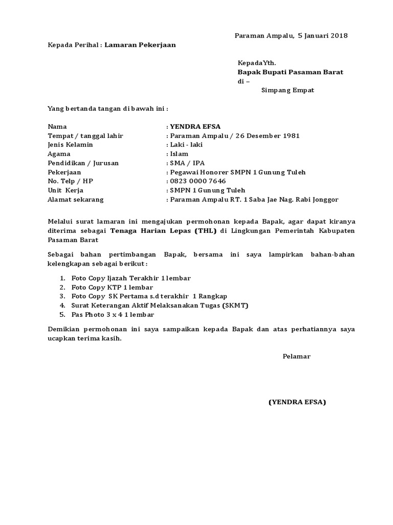 Lamaran pekerjaan yth, bapak/ibu kepala sekolah yayasan paud fotocopy kartu pencari kerja (kartu kuning) dilegalisir pejabat yang bertugas, surat keterangan sehat 1 lembar, photocopy identitas diri/ktp 1 lembar Surat lamaran kerja ialah surat yang ditulis/dibuat oleh seseorang dan ditujukan kepada suatu perusahaan/instansi dengan tujuan untuk melamar pekerjaan. Tak berbeda jauh dengan guru smp contoh surat lamaran kerja guru tulis tangan. Alangkah lebih baik bila surat lamaran ditulis dengan menggunakan. Contoh surat lamaran kerja berikut ini bisa dijadikan sebagai refrensi bagi yang hendak melamar sebuah pekerjaan, simak ulasan lengkapnya berikut ini ya.